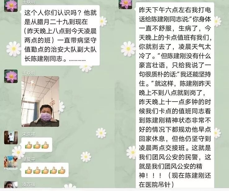 短短的一周,在抗击疫情的战斗中,团风公安涌现出一大批先进典型,叙说着一件一件感人的警察故事。有带病坚持上岗一声不吭的,有青丝变白发,依然披甲上阵的,有双警夫妻档、父子兵双倍担当的,有三警家庭在防疫战中形成“警三角”熠熠生辉的,有天使白配警服蓝,夫妻在医疗、公安两个岗位并肩战斗的,有身患癌症,依旧请缨上阵的,有巾帼不让须眉的。与此同时,真心换真情,广大群众也积极参与疫情防控,主动帮助民警,服务警务,一批一批手套口罩送到执勤卡点,一碗一碗夜宵送到深夜值守的民警手中,诠释着警民鱼水深情。